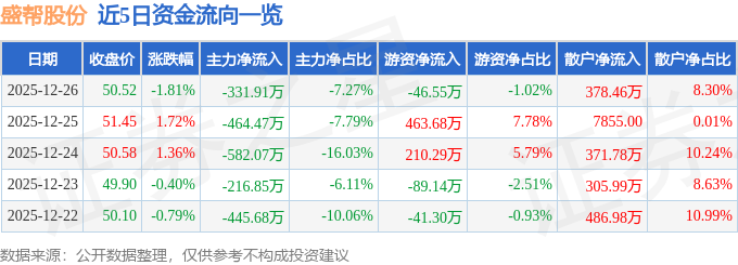 证券之星消息,截至2025年12月26日收盘,盛帮股份(301233)报收于50.52元,下跌1.81%,换手率4.5%,成交量8957.0手,成交额4562.47万元。