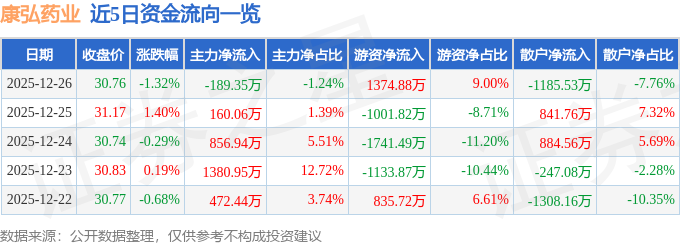 证券之星消息,截至2025年12月26日收盘,康弘药业(002773)报收于30.76元,下跌1.32%,换手率0.72%,成交量4.95万手,成交额1.53亿元。