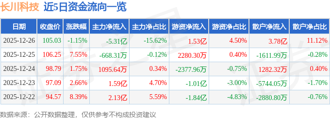 12月26日的资金流向数据方面,主力资金净流出5.31亿元,占总成交额15.62%,游资资金净流入1.53亿元,占总成交额4.5%,散户资金净流入3.78亿元,占总成交额11.12%。