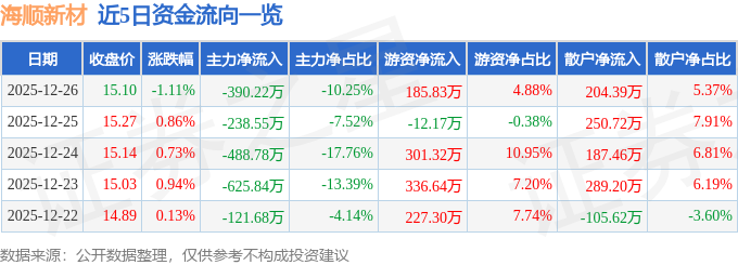 证券之星消息,截至2025年12月26日收盘,海顺新材(300501)报收于15.1元,下跌1.11%,换手率2.0%,成交量2.5万手,成交额3808.0万元。