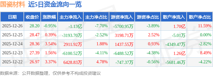 证券之星消息,截至2025年12月26日收盘,国瓷材料(300285)报收于28.2元,下跌0.95%,换手率6.1%,成交量51.34万手,成交额14.64亿元。