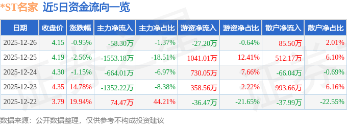 证券之星消息,截至2025年12月26日收盘,*ST名家(300506)报收于4.15元,下跌0.95%,换手率1.39%,成交量10.22万手,成交额4250.41万元。