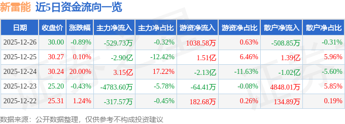 证券之星消息,截至2025年12月26日收盘,新雷能(300593)报收于30.0元,下跌0.89%,换手率12.2%,成交量54.95万手,成交额16.54亿元。