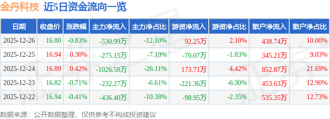 证券之星消息,截至2025年12月26日收盘,金丹科技(300829)报收于16.8元,下跌0.83%,换手率1.64%,成交量2.6万手,成交额4388.64万元。