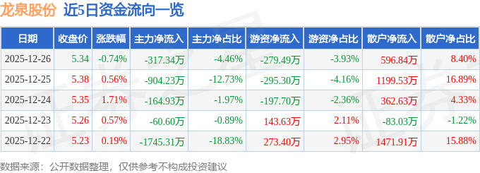 证券之星消息,截至2025年12月26日收盘,龙泉股份(002671)报收于5.34元,下跌0.74%,换手率2.41%,成交量13.27万手,成交额7108.12万元。
