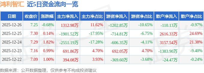 证券之星消息,截至2025年12月26日收盘,鸿利智汇(300219)报收于7.25元,下跌0.68%,换手率2.21%,成交量15.62万手,成交额1.13亿元。
