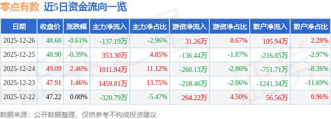 12月26日的资金流向数据方面,主力资金净流出137.19万元,占总成交额2.96%,游资资金净流入31.26万元,占总成交额0.67%,散户资金净流入105.94万元,占总成交额2.28%。