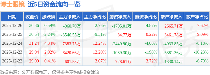 证券之星消息,截至2025年12月26日收盘,博士眼镜(300622)报收于30.36元,下跌0.59%,换手率7.42%,成交量11.56万手,成交额3.5亿元。