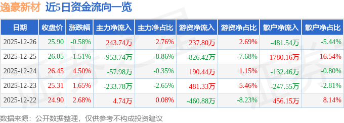 证券之星消息,截至2025年12月26日收盘,逸豪新材(301176)报收于25.9元,下跌0.58%,换手率6.02%,成交量3.39万手,成交额8843.96万元。