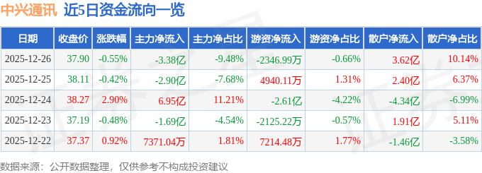 证券之星消息,截至2025年12月26日收盘,中兴通讯(000063)报收于37.9元,下跌0.55%,换手率2.34%,成交量94.24万手,成交额35.67亿元。
