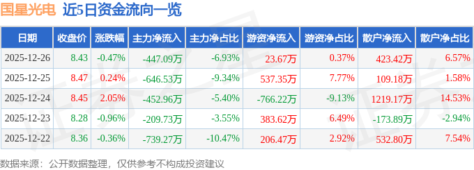 证券之星消息,截至2025年12月26日收盘,国星光电(002449)报收于8.43元,下跌0.47%,换手率1.23%,成交量7.64万手,成交额6448.42万元。
