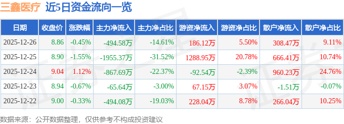 证券之星消息,截至2025年12月26日收盘,三鑫医疗(300453)报收于8.86元,下跌0.45%,换手率1.06%,成交量3.81万手,成交额3386.07万元。