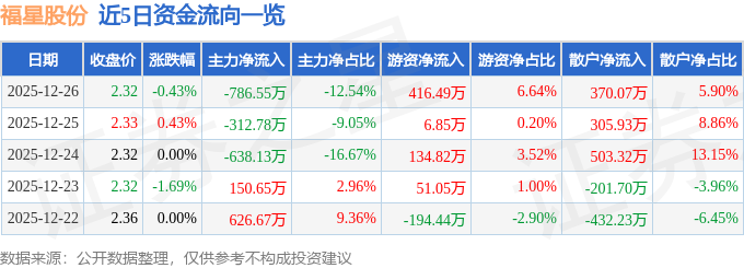 证券之星消息,截至2025年12月26日收盘,福星股份(000926)报收于2.32元,下跌0.43%,换手率1.71%,成交量26.91万手,成交额6273.87万元。