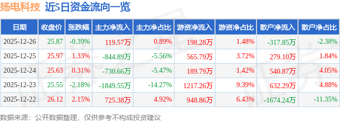 证券之星消息,截至2025年12月26日收盘,扬电科技(301012)报收于25.87元,下跌0.39%,换手率2.62%,成交量5.16万手,成交额1.34亿元。