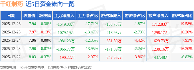 证券之星消息,截至2025年12月26日收盘,千红制药(002550)报收于7.94元,下跌0.38%,换手率1.17%,成交量11.01万手,成交额8748.12万元。