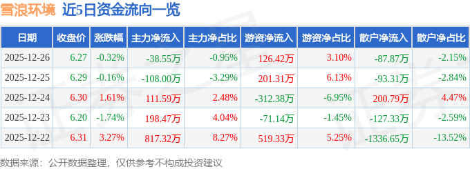 证券之星消息,截至2025年12月26日收盘,雪浪环境(300385)报收于6.27元,下跌0.32%,换手率2.23%,成交量6.48万手,成交额4078.75万元。