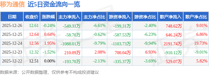 证券之星消息,截至2025年12月26日收盘,移为通信(300590)报收于12.61元,下跌0.24%,换手率1.86%,成交量6.6万手,成交额8309.78万元。