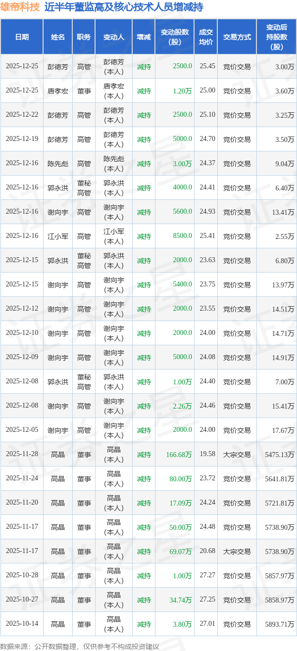 雄帝科技近半年内的董监高及核心技术人员增减持详情如下: