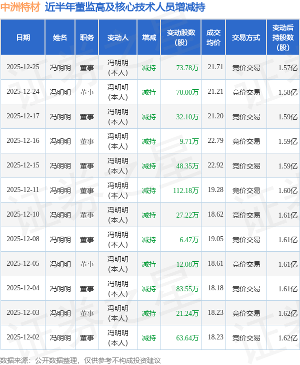 中洲特材近半年内的董监高及核心技术人员增减持详情如下: