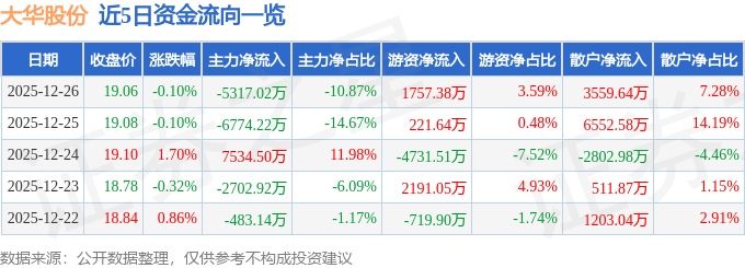证券之星消息,截至2025年12月26日收盘,大华股份(002236)报收于19.06元,下跌0.1%,换手率1.21%,成交量25.59万手,成交额4.89亿元。