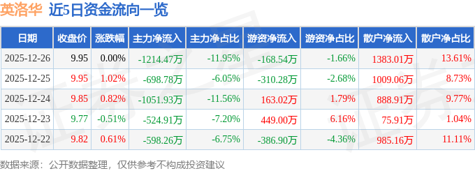 证券之星消息,截至2025年12月26日收盘,英洛华(000795)报收于9.95元,上涨0.0%,换手率0.9%,成交量10.19万手,成交额1.02亿元。