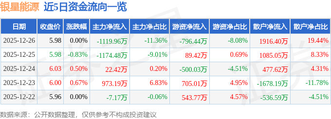 证券之星消息,截至2025年12月26日收盘,银星能源(000862)报收于5.98元,上涨0.0%,换手率2.62%,成交量16.47万手,成交额9858.72万元。