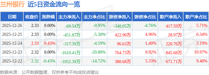 证券之星消息,截至2025年12月26日收盘,兰州银行(001227)报收于2.33元,上涨0.0%,换手率0.75%,成交量31.4万手,成交额7313.81万元。