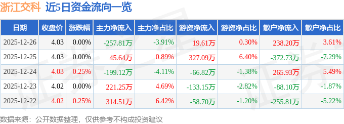 证券之星消息,截至2025年12月26日收盘,浙江交科(002061)报收于4.03元,上涨0.0%,换手率0.63%,成交量16.32万手,成交额6593.56万元。