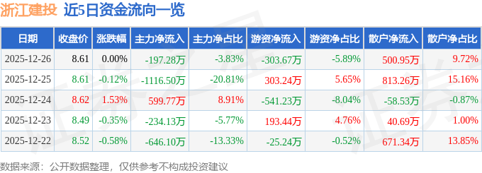 证券之星消息,截至2025年12月26日收盘,浙江建投(002761)报收于8.61元,上涨0.0%,换手率0.55%,成交量5.99万手,成交额5155.53万元。