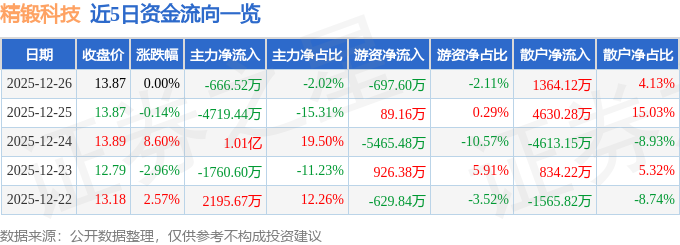 证券之星消息,截至2025年12月26日收盘,精锻科技(300258)报收于13.87元,上涨0.0%,换手率4.13%,成交量23.55万手,成交额3.3亿元。