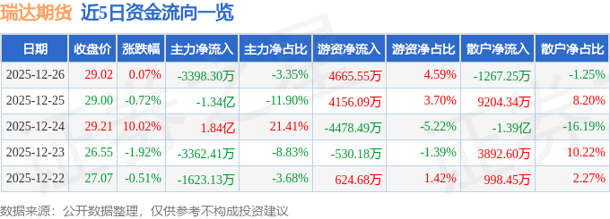 证券之星消息,截至2025年12月26日收盘,瑞达期货(002961)报收于29.02元,上涨0.07%,换手率7.65%,成交量34.7万手,成交额10.16亿元。
