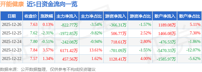 证券之星消息,截至2025年12月26日收盘,开能健康(300272)报收于7.63元,上涨0.13%,换手率6.52%,成交量30.27万手,成交额2.33亿元。
