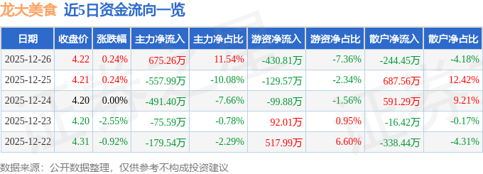 证券之星消息,截至2025年12月26日收盘,龙大美食(002726)报收于4.22元,上涨0.24%,换手率1.29%,成交量13.9万手,成交额5853.9万元。