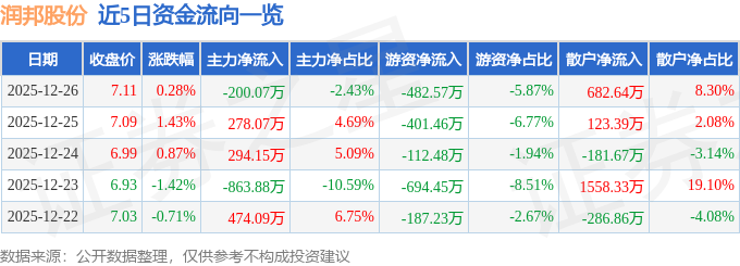 证券之星消息,截至2025年12月26日收盘,润邦股份(002483)报收于7.11元,上涨0.28%,换手率1.3%,成交量11.55万手,成交额8221.05万元。