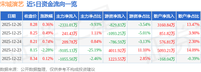 证券之星消息,截至2025年12月26日收盘,宋城演艺(300144)报收于8.28元,上涨0.36%,换手率1.2%,成交量28.4万手,成交额2.35亿元。