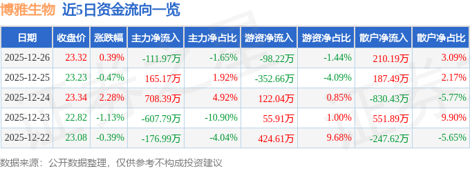 证券之星消息,截至2025年12月26日收盘,博雅生物(300294)报收于23.32元,上涨0.39%,换手率0.58%,成交量2.92万手,成交额6805.51万元。