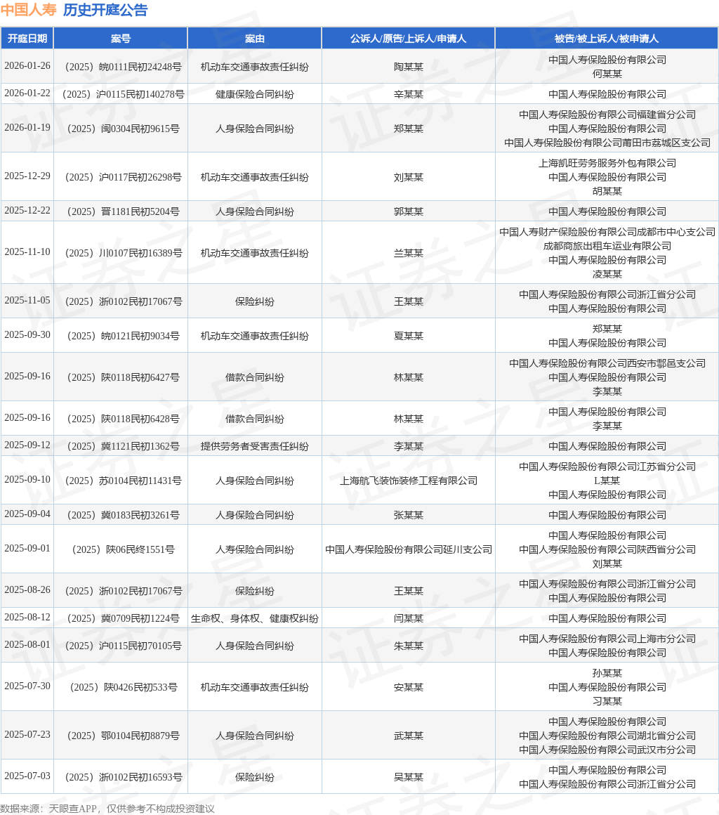 案号:(2025)沪0117民初26298号根据统计,近一年内以中国人寿保险股份有限公司为当事人的历史开庭公告有49则,其中案由为“人身保险合同纠纷”的公告以12则居首,其次为“机动车交通事故责任纠纷”有9则,“保险纠纷”有6则。历史开庭公告(前20条)如下:
