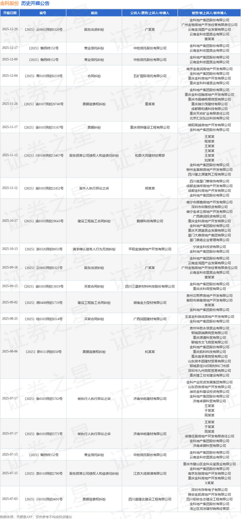 案号:(2025)云0602民初6320号根据统计,近一年内以金科地产集团股份有限公司为当事人的历史开庭公告有96则,其中案由为“票据纠纷”的公告以25则居首,其次为“票据追索权纠纷”有11则,“劳动争议”有10则。历史开庭公告(前20条)如下: