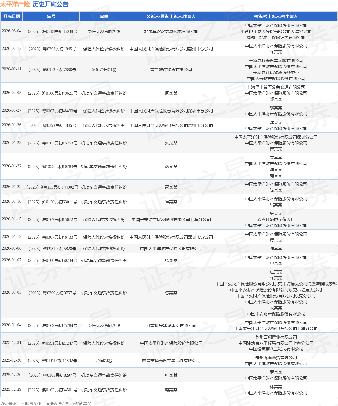 案号:(2024)粤0111民诉前调55178号根据统计,近一年内以中国太平洋财产保险股份有限公司为当事人的历史开庭公告有684则,其中案由为“机动车交通事故责任纠纷”的公告以445则居首,其次为“保险人代位求偿权纠纷”有79则,“非机动车交通事故责任纠纷”有28则。历史开庭公告(前20条)如下: