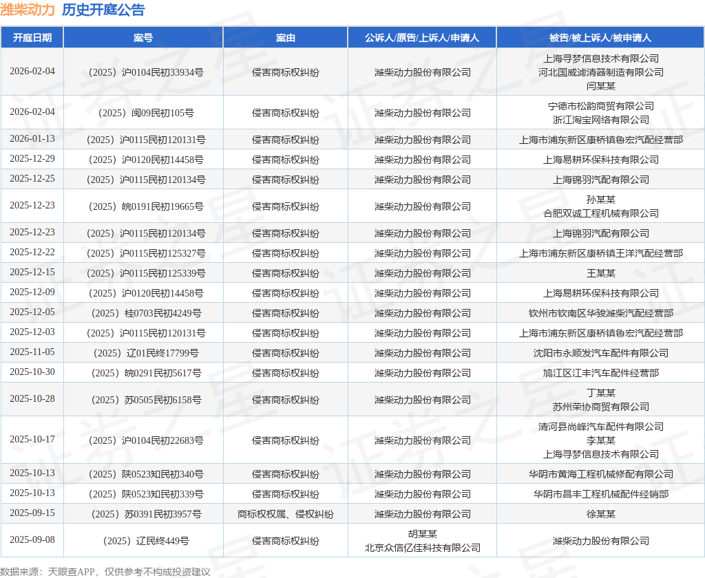 案号:(2025)沪0120民初14458号根据统计,近一年内以潍柴动力股份有限公司为当事人的历史开庭公告有78则,其中案由为“侵害商标权纠纷”的公告以58则居首,其次为“买卖合同纠纷”有8则,“商标权权属、侵权纠纷”有6则。历史开庭公告(前20条)如下: