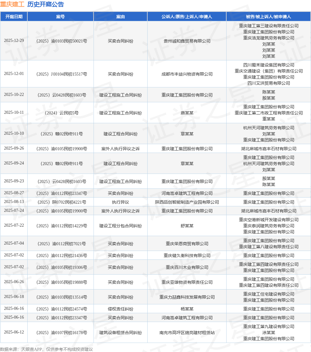 案号:(2025)渝0103民初50021号根据统计,近一年内以重庆建工集团股份有限公司为当事人的历史开庭公告有310则,其中案由为“买卖合同纠纷”的公告以115则居首,其次为“劳务合同纠纷”有31则,“建设工程施工合同纠纷”有29则。历史开庭公告(前20条)如下: