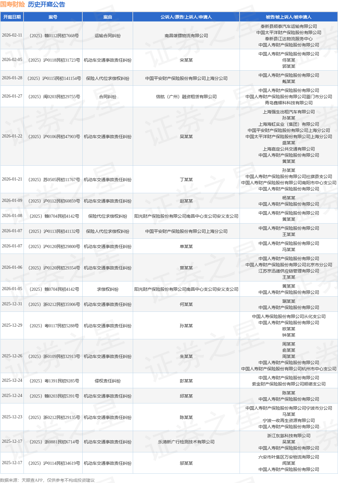 案号:(2025)粤0117民初5288号根据统计,近一年内以中国人寿财产保险股份有限公司为当事人的历史开庭公告有414则,其中案由为“机动车交通事故责任纠纷”的公告以267则居首,其次为“保险人代位求偿权纠纷”有48则,“保险纠纷”有12则。历史开庭公告(前20条)如下: