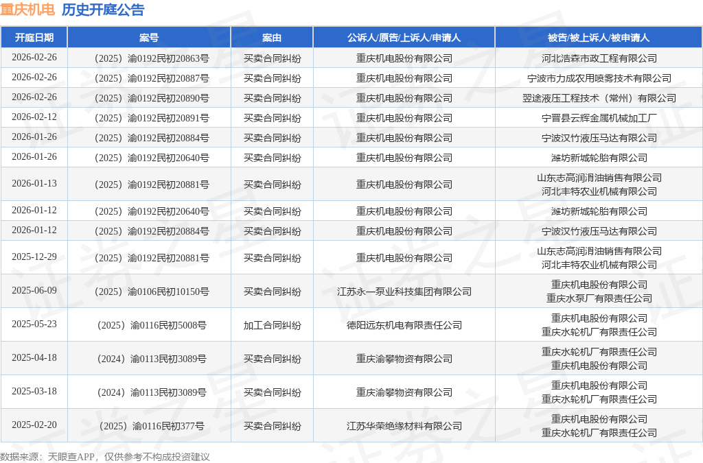 根据统计,近一年内以重庆机电股份有限公司为当事人的历史开庭公告有15则,其中案由为“买卖合同纠纷”的公告以14则居首,其次为“加工合同纠纷”有1则。历史开庭公告如下: