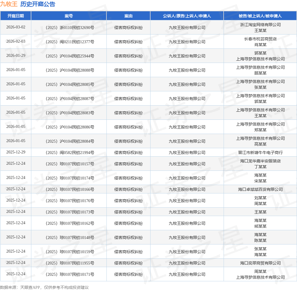 案号:(2025)闽0582民初21994号根据统计,近一年内以九牧王股份有限公司为当事人的历史开庭公告有108则,其中案由为“侵害商标权纠纷”的公告以97则居首,其次为“劳动争议”有3则,“不正当竞争纠纷”有2则。历史开庭公告(前20条)如下:
