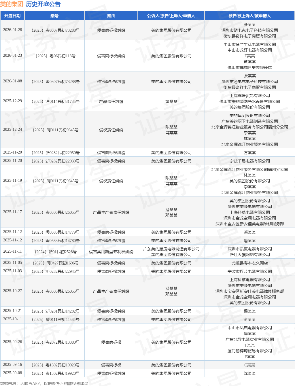 案号:(2025)沪0114民初31735号根据统计,近一年内以美的集团股份有限公司为当事人的历史开庭公告有50则,其中案由为“侵害商标权纠纷”的公告以29则居首,其次为“产品责任纠纷”有4则,“侵害商标权”有4则。历史开庭公告(前20条)如下: