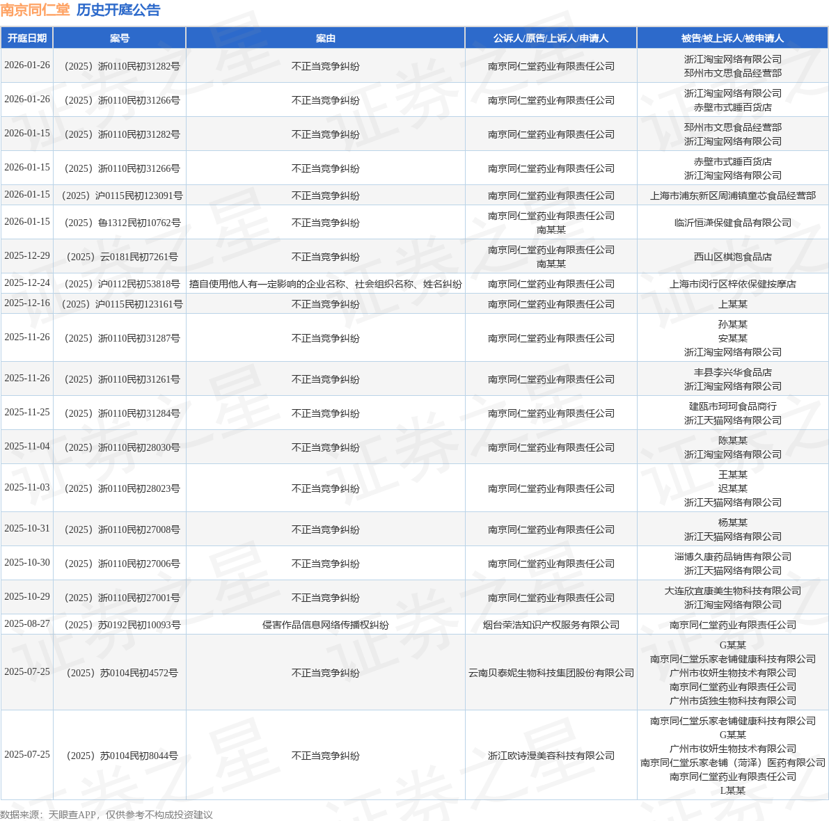 案号:(2025)云0181民初7261号根据统计,近一年内以南京同仁堂药业有限责任公司为当事人的历史开庭公告有39则,其中案由为“不正当竞争纠纷”的公告以24则居首,其次为“仿冒纠纷”有3则,“侵害作品信息网络传播权纠纷”有3则。历史开庭公告(前20条)如下: