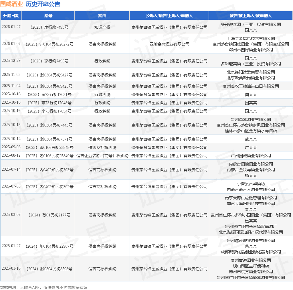 案号:(2025)京行终7495号根据统计,近一年内以贵州茅台镇国威酒业(集团)有限责任公司为当事人的历史开庭公告有17则,其中案由为“侵害商标权纠纷”的公告以11则居首,其次为“行政纠纷”有4则,“侵害企业名称(商号)权纠纷”有1则。历史开庭公告如下: