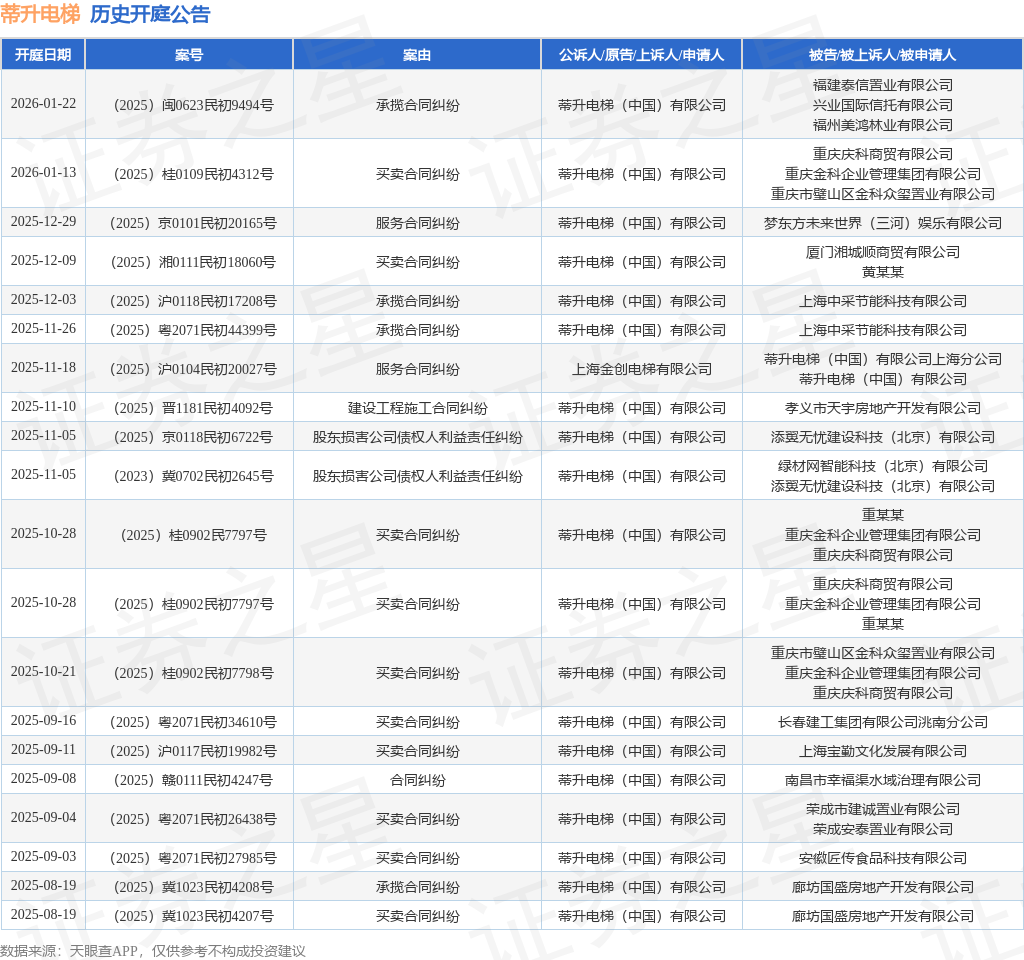 案号:(2025)京0101民初20165号根据统计,近一年内以蒂升电梯(中国)有限公司为当事人的历史开庭公告有79则,其中案由为“买卖合同纠纷”的公告以46则居首,其次为“承揽合同纠纷”有13则,“合同纠纷”有5则。历史开庭公告(前20条)如下: