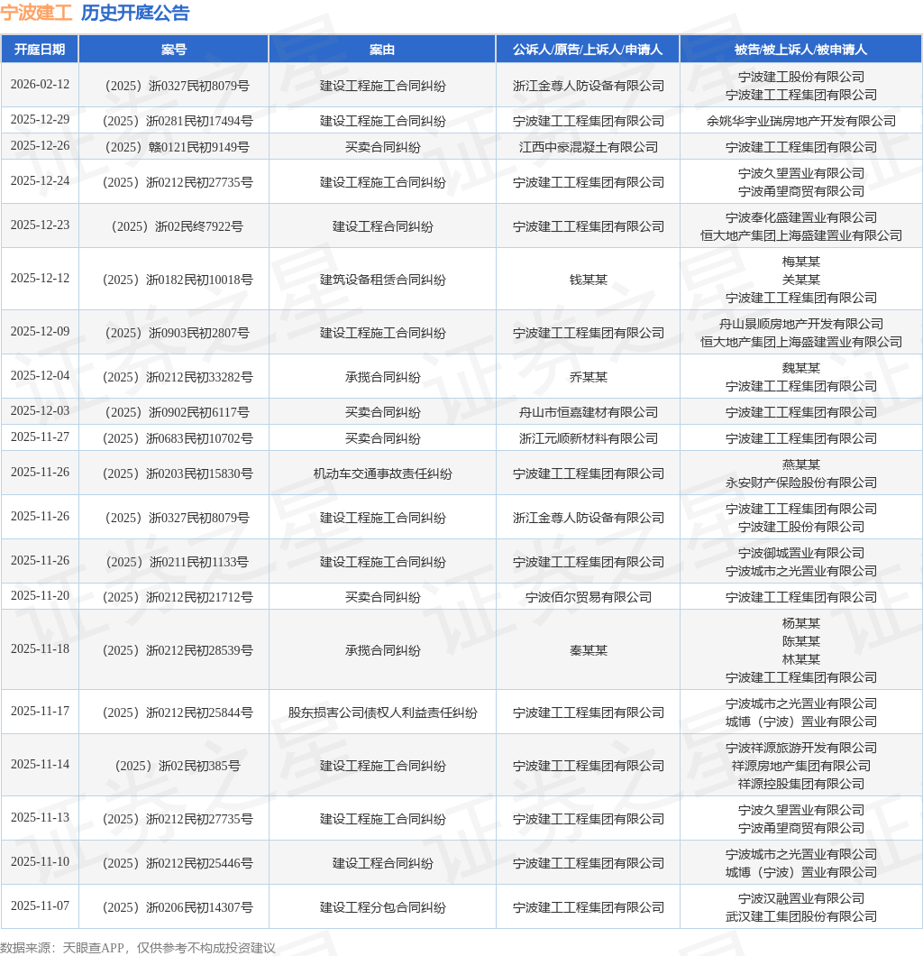 案号:(2025)浙0281民初17494号根据统计,近一年内以宁波建工工程集团有限公司为当事人的历史开庭公告有132则,其中案由为“建设工程施工合同纠纷”的公告以36则居首,其次为“买卖合同纠纷”有29则,“建设工程合同纠纷”有19则。历史开庭公告(前20条)如下: