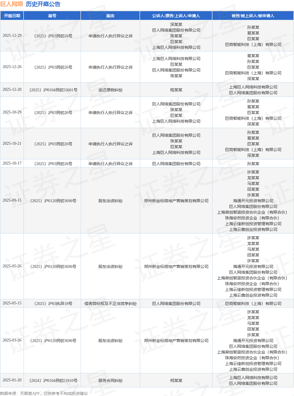 案号:(2025)沪03民初26号根据统计,近一年内以巨人网络集团股份有限公司为当事人的历史开庭公告有11则,其中案由为“申请执行人执行异议之诉”的公告以5则居首,其次为“股东出资纠纷”有3则,“侵害商标权及不正当竞争纠纷”有1则。历史开庭公告如下: